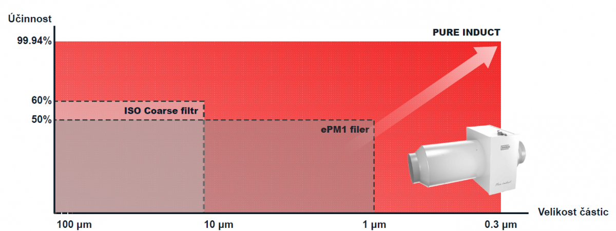 Pure Induct odstraňuje téměř všechny jemné a ultra jemné částice prachu, zimní smog, jemné saze a výrazně eliminuje zápachy. Zajišťuje tak ideálně čistý a zdravý vnitřní vzduch.